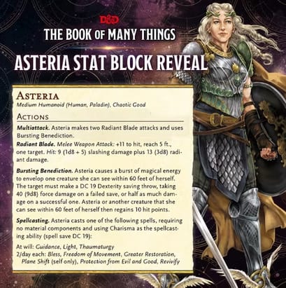 Esta nova heroína é uma Paladina poderosa, com seu bloco de estatísticas de Dungeons and Dragons definido como Classificação de Desafio de 18. No entanto, mais do que seu poder, a história fundamentada de Asteria é o que atraiu a atenção de muitos jogadores. Embora ela tenha se tornado imortal através do desafio ao deus do Destino e ao Baralho de Muitas Coisas, Asteria é uma personagem identificável, especialmente para jogadores com autismo: em suas anotações pessoais ao longo do Livro de Muitas Coisas, ela revela que luta com protetores de ouvido, esquece de comer e fica superestimulada durante certos desafios angustiantes.
