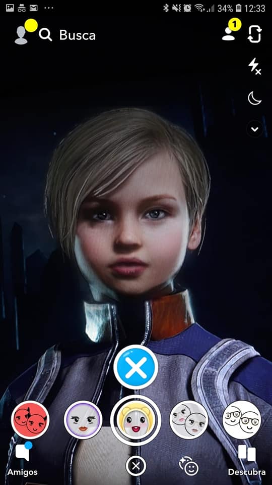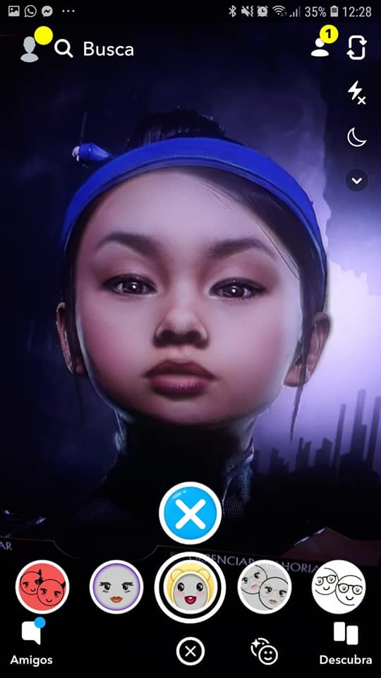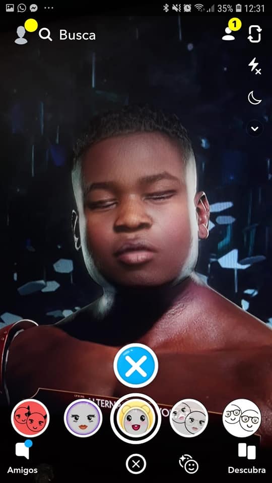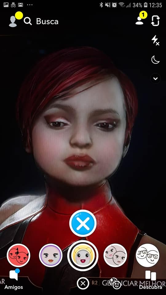 - Escolha o filtro de bebê, (face de boca aberta e orelhinhas) encaixe o rosto transformado no molde azul, aperte a câmera e aguarde;