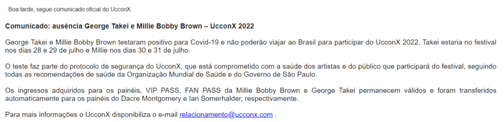 Além de Millie, o ator George Takei, ator de Star Trek 1ª Geração, também foi diagnosticado com COVID-19 e desfalcará o elenco anunciado pela organização até o momento. Confira o comunicado oficial enviado ao Observatório de Games: