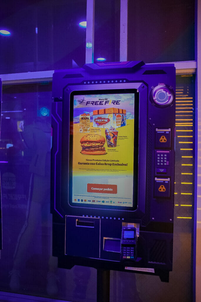 Logo ao entrar para fazer seu pedido, os jogadores conseguirão identificar o mesmo layout da vending machine do jogo no totem de auto atendimento da loja. A interface do Free Fire saiu das telas e pode ser utilizada para pedir o seu Combo Free Fire.