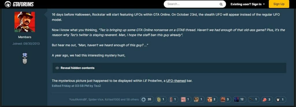 De acordo com Tez2, GTA Online pode começar a apresentar OVNIs, o que levará a Rockstar a mencionar essas espaçonaves alienígenas em um post no Twitter. Foi sugerido que este post de mídia social poderia conter uma dica sobre quando os fãs podem esperar um anúncio do GTA 6. Tez2 dá o exemplo de uma foto com talvez uma menção a “tempestades tropicais em dois dias”, que seria a data prevista para o anúncio.