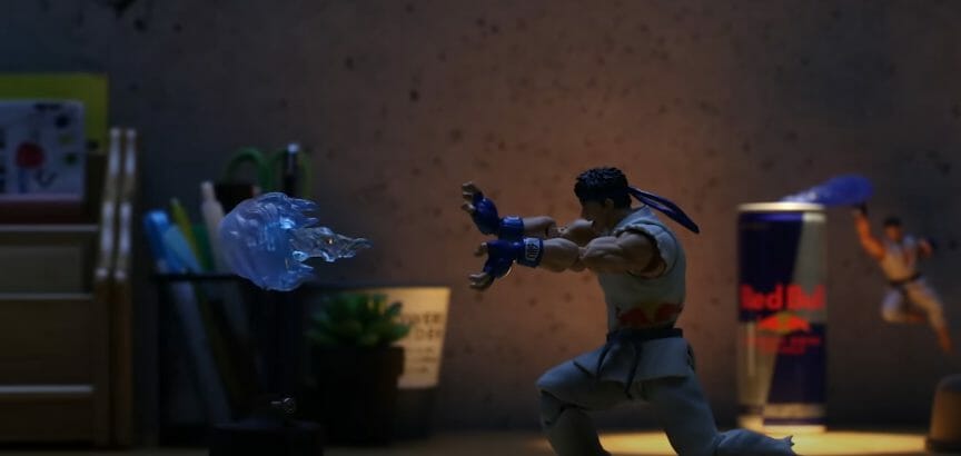 Para as cenas de luta entre os personagens de Street Fighter e a lata de Red Bull foram usados suportes com hastes metálicas, fita adesiva na ponta das hastes e, claro, muita paciência para fotografar cada frame desejado. Confira o resultado abaixo, que já soma mais de 1 milhão de visualizações só no canal oficial: