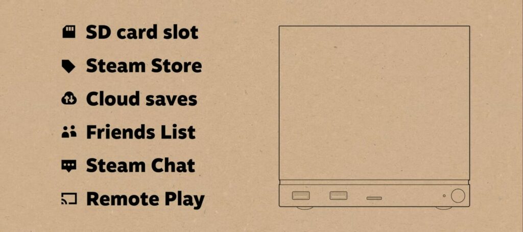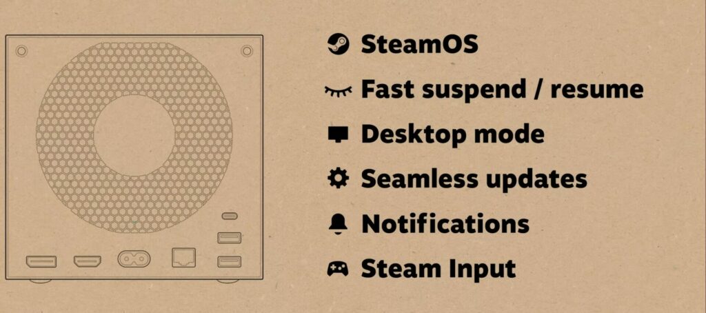 Seis vezes mais potente que o Steam Deck, o console portátil da empresa, o console da vez possui uma porta Gigabit Ethernet, DisplayPort 1.4 e HDMI 2.0, fonte interna, além de uma porta USB-C e Sua fonte de alimentação será integrada, ou seja, não terá um adaptador de energia externo.
