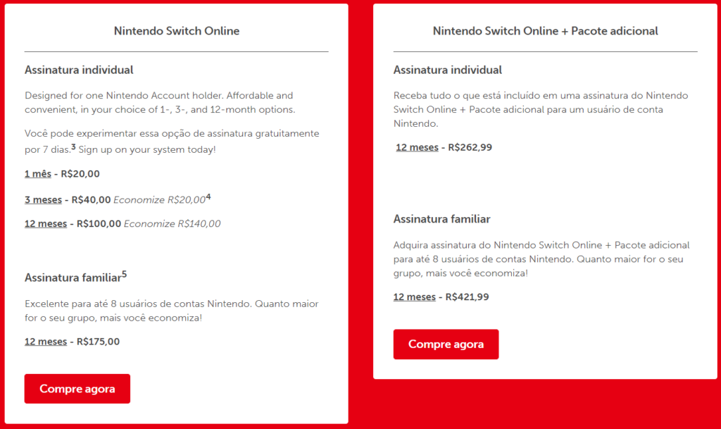 Ainda mais benefícios se acumulariam ao lado dele, como uma biblioteca SNES e acesso a jogos como Tetris 99. Este pacote básico custa R$ 20,00 por mês, R$ 40,00 por trimestre ou R$ 100,00 por ano, e a Nintendo oferece uma assinatura familiar para até oito usuários que custa R$ 421,99 por ano.