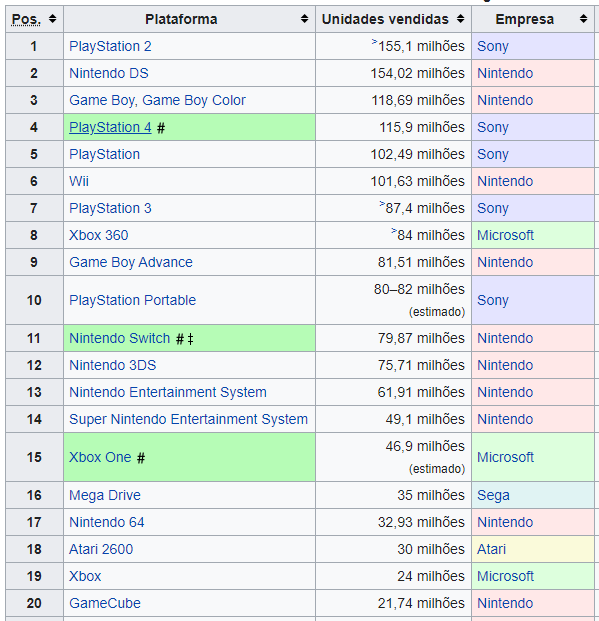 Acima você pode conferir o gráfico atualizado da posição do Nintendo Switch em relação aos outros consoles da própria empresa. Abaixo a lista dos 20 consoles mais vendidos até hoje. Os que estão com hashtag e fundo verde, indicam os consoles da geração atual que ainda estão no mercado
