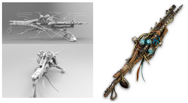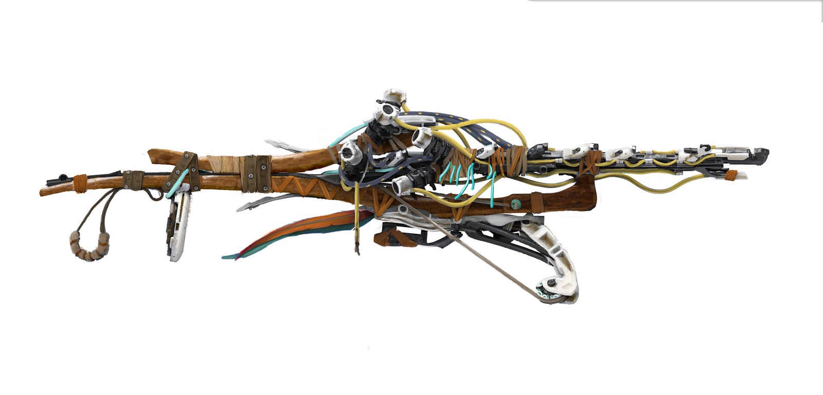 “O Improved Stormslinger começou como uma melhoria da lança que o xamã da tribo Banuk, Ourea usa na expansão de Horizon Zero Dawn, The Frozen Wilds. Para o design, usamos as partes técnicas da lança e as ajustamos no molde de um ‘ropecaster’, que nos permitiu aumentar seu poder. Usando o conceito de “quanto mais poder melhor” como princípio guia, adicionamos mais capacitores e todas as partes tecnológicas junto.