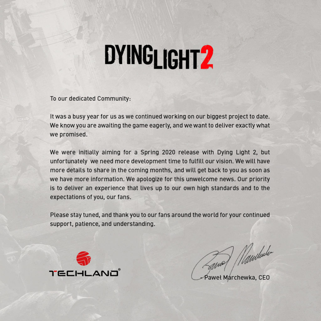 Dying Light 2 estava previsto para ser lançado entre março e junho deste ano, mas a Techland, anunciou nesta segunda-feira (20) que precisava de mais tempo para desenvolver a sequência de sua franquia e não conseguirá cumprir com a previsão de lançamento.