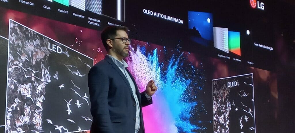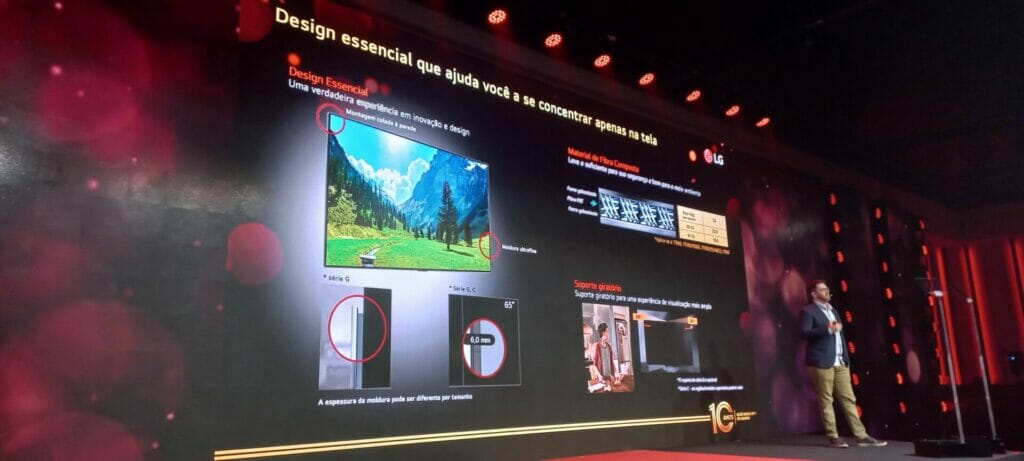 Igor Krauniski, Gerente Sênior de Produto de TV da LG, demonstra detalhes das novas tecnologias da empresa, como o design que permite que a TV fique a apenas 6mm da parede. (Imagem: Observatório de Games).