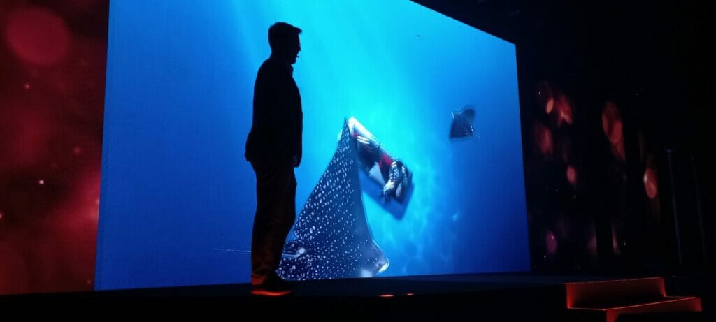 Um outro modelo que movimentou câmeras no evento foi a curiosa LG Signature OLED M3, apresentada como a primeira TV sem fio do mundo. O aparelho possui uma tela de 97 polegadas com resolução 4K e 120Hz e nenhuma tomada conectada fisicamente ao aparelho.