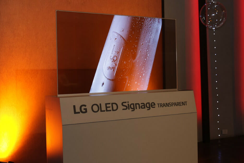 No espaço reservado para admiração dos modelos por vir, uma dos destaques mais impressionantes foi a LG OLED Signage, uma tv que possui uma tela literalmente transparente. Nela, quando o modelo está desligado, é possível ver o outro lado da tela, já quando a tv está em uso, ainda é possível ver o lado de trás da tela em pontos sem luz da imagem.