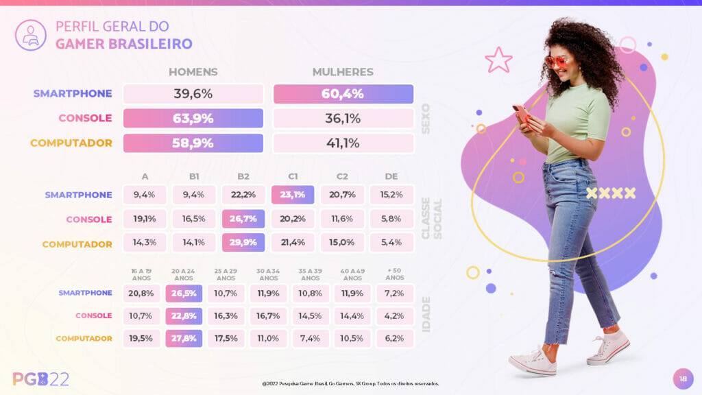 Os negros prevalecem no levantamento de grupos étnicos, com a soma de pretos e pardos, representando 49,4% dos entrevistados; 46,6% são pessoas que se identificam como brancas. Já as mulheres, representam 60,4% do público que joga nos smartphones, sendo cerca de 46% do público total levando em consideração todos os tipos de plataforma.