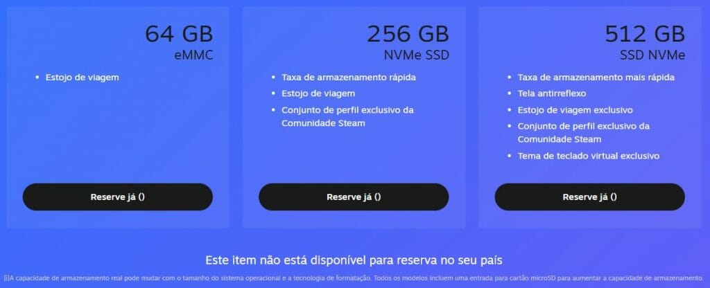 Começando direto com o que todos querem saber! De acordo com o site da Steam, ele já está disponível para reserva em algumas regiões, com entrega prevista para começar em fevereiro de 2022. São três versões para ser reservadas, conforme imagem acima. Quando o estoque estiver disponível, os usuários serão notificados de acordo com a ordem das reservas para que a compra seja realizada. Vale destacar que o Steam Deck ainda não está disponível para o Brasil.