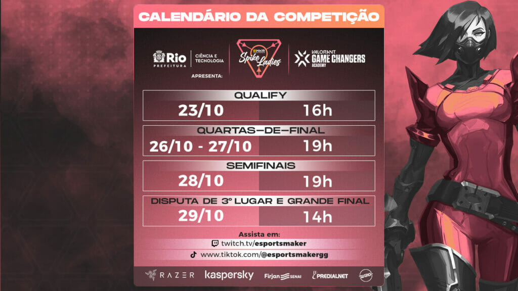 Patrocinadores – A atual edição chega forte mais uma vez! A Secretaria Municipal de Ciência e Tecnologia do Rio de Janeiro, através da Coordenadoria de Games e Esports tem a honra de apresentar o Spike Ladies IV, mostrando para todo o Brasil a força dos esports e dos games na cidade carioca. O Rio é a primeira cidade do país a ter uma Coordenadoria de Games e Esports criada para fomentar o cenário, integrando a Secretaria Municipal de Ciência e Tecnologia (SMCT) a esse importante segmento. A Esportsmaker celebra o retorno da Razer, marca que patrocina o Spike Ladies desde a primeira edição do campeonato assim como da Kaspersky e Firjan SENAI, que ao retornarem para esta edição reforçam o sucesso da parceria com a organizadora. A estreante da edição é a agência We Are Gamers (WAG), que nasceu em 2020 com o objetivo de facilitar o acesso ao mercado de games e esports e escolheu os campeonatos da Esportsmaker para reforçar seu posicionamento estratégico na indústria. Fechando a seleção de grandes parceiros da edição, temos a Predialnet, que é a Internet Oficial do Spike Ladies IV. “O Spike Ladies é um dos torneios femininos mais importantes do Brasil e é realizado pela principal empresa focada em esports do Estado. Para nós, essa é uma grande oportunidade de contribuir com o desenvolvimento do cenário e pôr em prática nosso projeto de pensar políticas públicas, entre outras iniciativas voltadas para esse ecossistema no Rio de Janeiro”, comenta Amaury Cardoso, Chefe de Gabinete da SMCT.