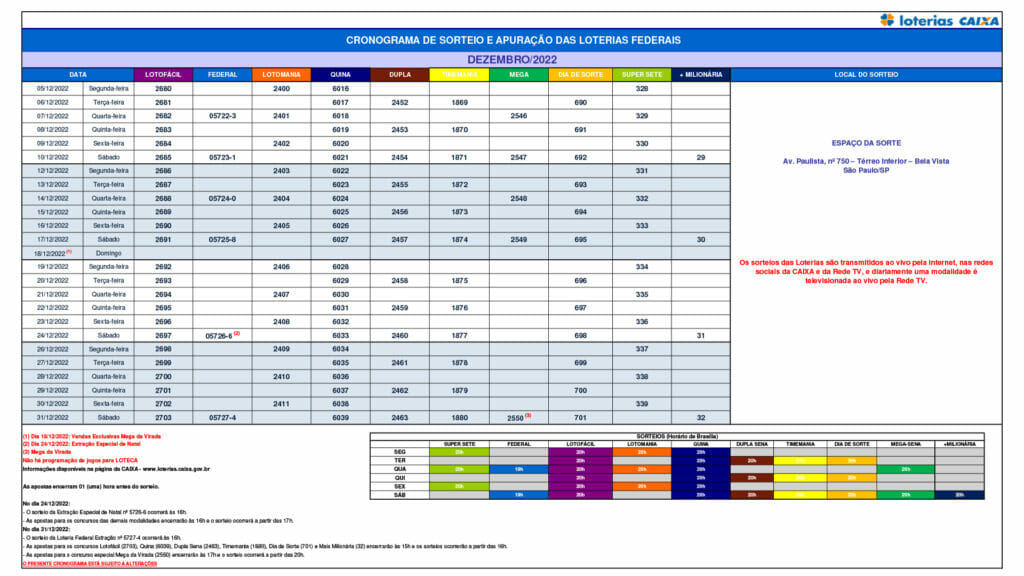 Calendario sorteio loterias dezembor 2022