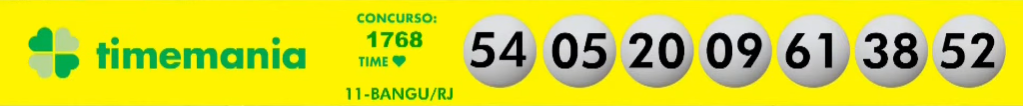 Neste sábado, a Caixa sorteou o concurso 1768 da Timemania, cuja premiação estava avaliada até o momento do sorteio em R$ 7.800.000,00. Confira abaixo: