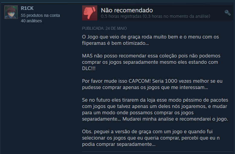 Ao clicar para ver os comentários dos usuários se torna uma realidade justa estas recomendações negativas, principalmente porque os fãs não podem comprar DLCs separadas, sendo obrigados a adquirir um Pacote Completo. Por exemplo: caso deseje apenas o título 19xx, terá que levar junto todo o Capcom Arcade Stadium Pack 3: Arcade Evolution (’92 – ’01). Não tem como adquirir apenas o game de batalha de avião, tem que levar os outros jogos, mesmo que não os queira.