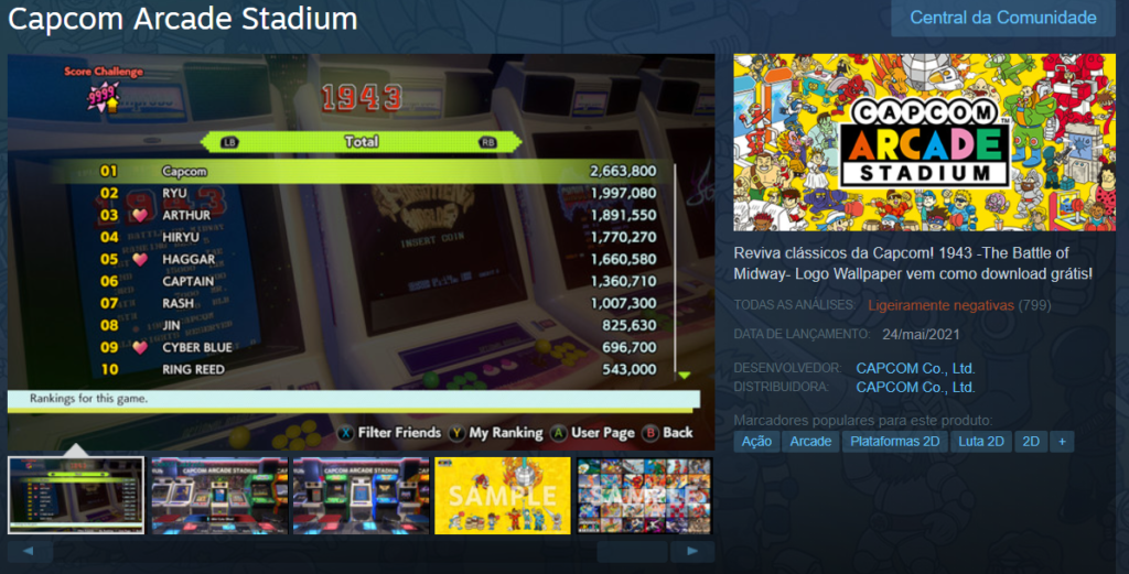 Por isso, lançar todos estes clássicos através de uma coletânea com o título Capcom Arcade Stadium era de se esperar recomendações acima do normal, mas não é bem assim. Ao pesquisar pelo nome do lançamento da Capcom no Steam, irá ficar espantado ao ver que esta coletânea tem 799 (até o momento deste artigo) com a chamada de Ligeiramente Negativa.