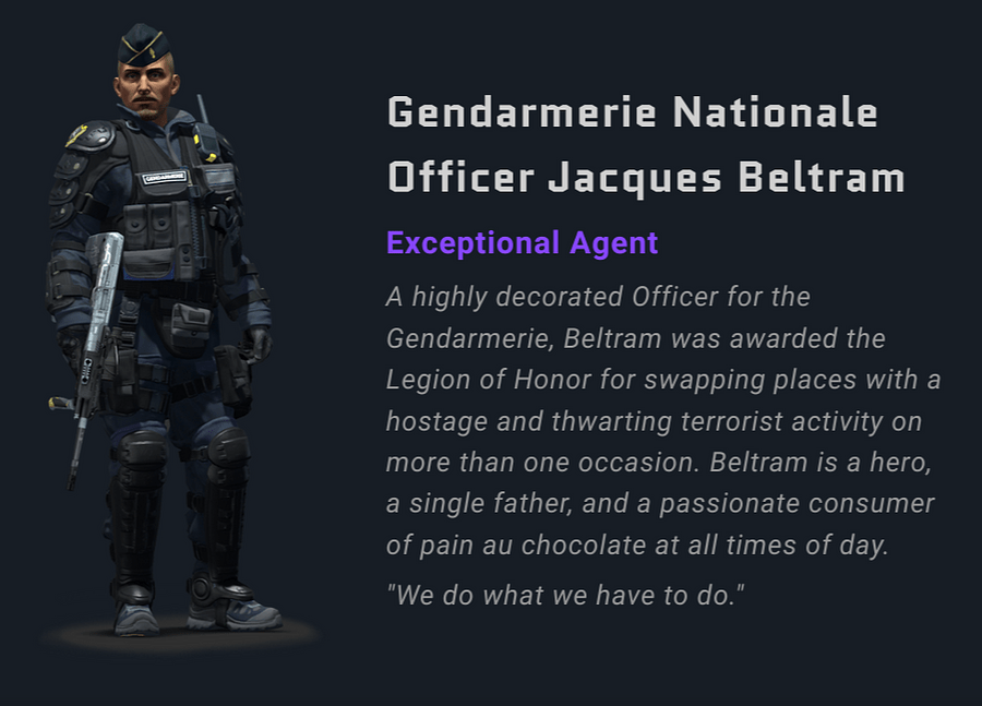 O oficial da Gendarmerie Nationale, Jacques Beltram, é o agente do CS: GO baseado no mártir francês, que era tenente-coronel da Gendarmerie Nationale francesa. A descrição do personagem do jogo foi inspirada na de Beltrame, após o incidente de 24 de março de 2018, quando ele foi assassinado por um terrorista durante um ataque a um supermercado na cidade de Trèbes, no sul da França.