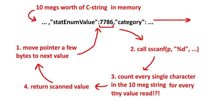 Em primeiro lugar, devido ao protocolo estranho inerente a uma função C++ chamada sscanf, por cada poucos bytes de dados carregados cada caractere na sequência de 10mb é lido novamente, e novamente, e novamente, e novamente… infinitamente.