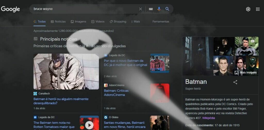 Diferente das outras vezes que é necessário clicar no “Estou com Sorte”, desta vez é só entrar na página principal do Google, clicando aqui. Digite Bat-Signal, Bruce Wayne ou Gotham City. Dê um Enter e você será direcionado para a resposta da busca.