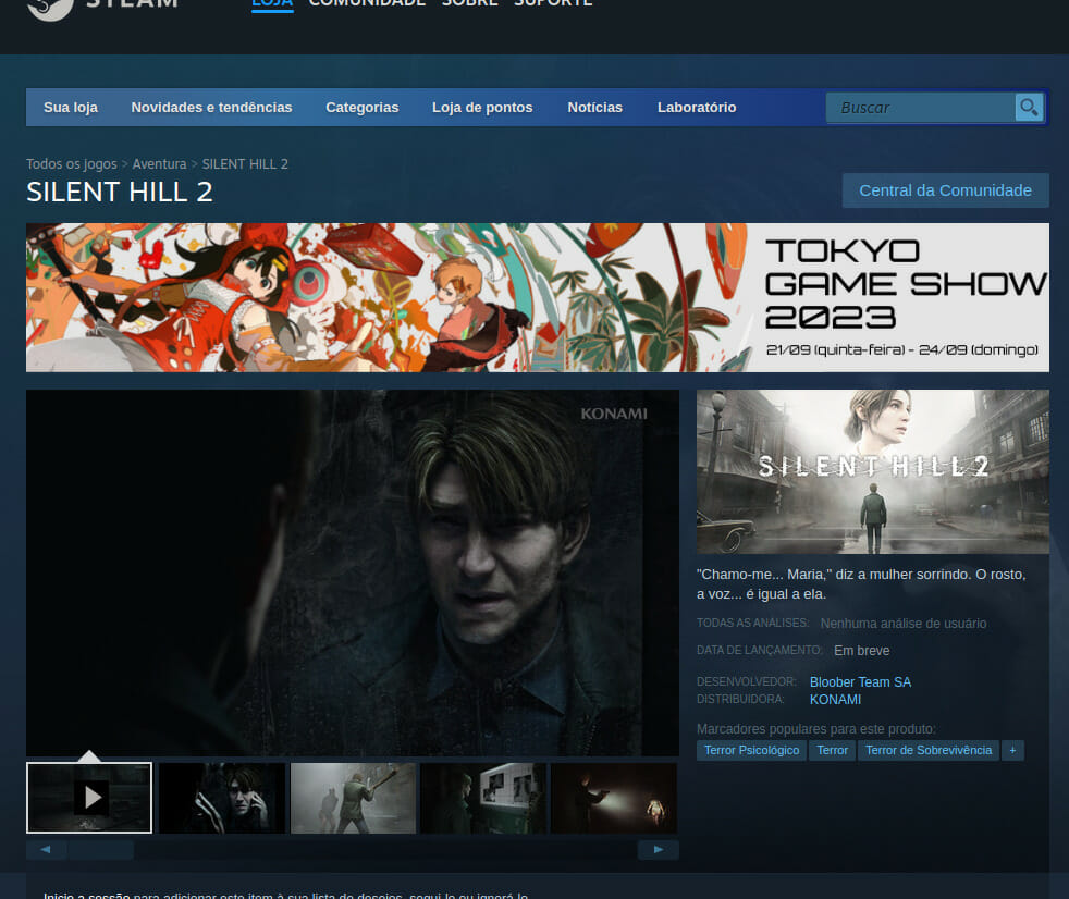 Avistado na página oficial do Steam de Silent Hill 2, um novo anúncio apareceu promovendo o Tokyo Game Show 2023. Para quem não sabe, o Tokyo Game Show é a maior convenção anual de jogos do Japão, onde muitos editores nativos do país compartilham novos detalhes sobre seus próximos títulos. Dado que a Konami é uma editora japonesa e este anúncio apareceu na página da loja de Silent Hill 2, alguns fãs inferiram que o remake poderia aparecer no evento de alguma forma, quando for executado entre 21 e 24 de setembro.