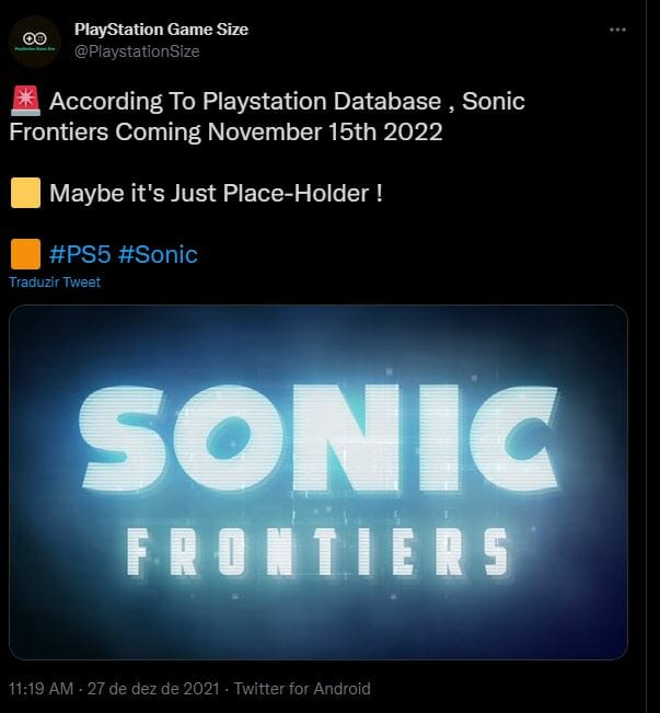 Um tweet recente do PlayStation Game Size, após atualizações no banco de dados do PlayStation, relatou que uma data de lançamento aparentemente havia sido listada nos bancos de dados da Sony para Sonic Frontiers. De acordo com as informações fornecidas por um PlayStation QA Tester, o mais novo jogo do Sonic está listado no banco de dados do PlayStation com uma data de lançamento definida para 15 de novembro de 2022. O relato é rápido em notar que a data pode não ser uma representação precisa de quando o jogo será lançado, o que implica que a data de novembro de 2022 pode ser apenas um espaço reservado.
