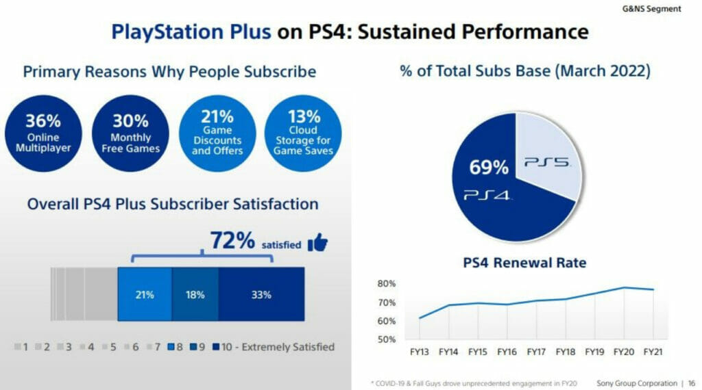 A Sony realizou recentemente uma pesquisa de satisfação do serviço de assinantes do PS Plus no PS4 (e não no PS5), relatando que 72% deles estão satisfeitos com o serviço. Para ser mais específico, 33% estavam “extremamente satisfeitos”, enquanto 18% avaliaram com nota 9 e 21% com nota 8. De acordo com os dados da Sony, que não revelam quantos assinantes foram pesquisados, 36% assinam o serviço online multijogador, 30% para os jogos mensais gratuitos, 21% para descontos em jogos e assim por diante e 13% para armazenamento em nuvem.