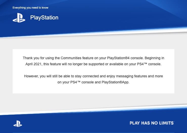 Conforme relatado pela Siliconera, a Sony anunciou a descontinuação em um e-mail enviado aos proprietários do PlayStation 4 recentemente, informando que Comunidades serão fechadas a partir de abril de 2021. A remoção do recurso já havia sido sinalizada anteriormente por convites privados para a atualização 8.50 beta do PS4, dentro da qual o Comunidades estava ausente, de acordo com os usuários do console.