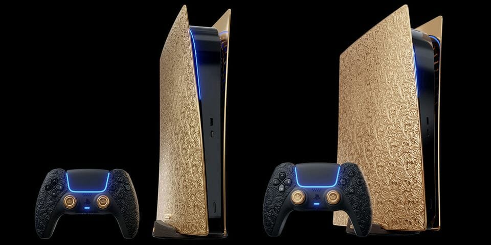Criado pela Caviar, uma marca de luxo focada na criação de itens de “luxo inteligente”, incluindo air pods de ouro 18K, Nikes personalizados e iPhones incrustados de diamantes, os PlayStation 5 banhados a ouro e ouro maciço são o empreendimento mais recente da empresa no ramo de jogos. Como o próprio nome sugere, a versão banhada a ouro cobre as duas placas frontais em ouro de 24 quilates com um padrão ornamentado em relevo que dá ao console um design luxuoso que custa US $ 12.750, algo em torno de R$70.452,67 na cotação de hoje (6).