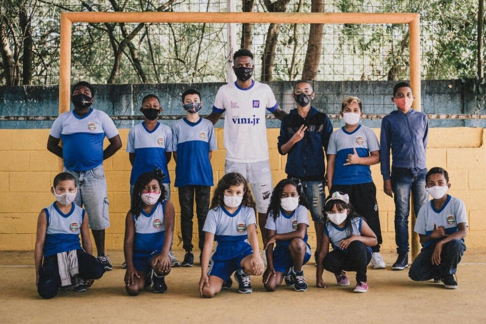 O jogador Vini Jr e crianças atendidas pelo INstituto Vini Ju. (Foto: arquivo do Instituto Vini Jr)