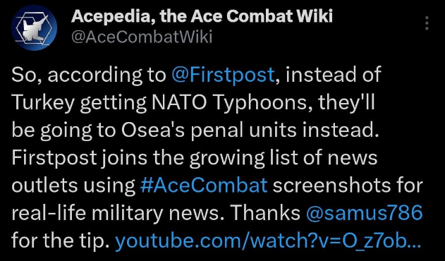 No Twitter / X, o perfil da Acepedia, uma wiki feita por fãs sobre a série postou sobre o ocorrido comenta ironizando o ocorrido, dizendo que “Em vez da Turquia receber os Typhoon da OTAN, eles irão receber da Unidade Penal de Osea. O Firstpost se junta a lista de sites de notícias a qual utiliza imagens do Ace Combat para notícias sobre aparelhos militares na vida real”.