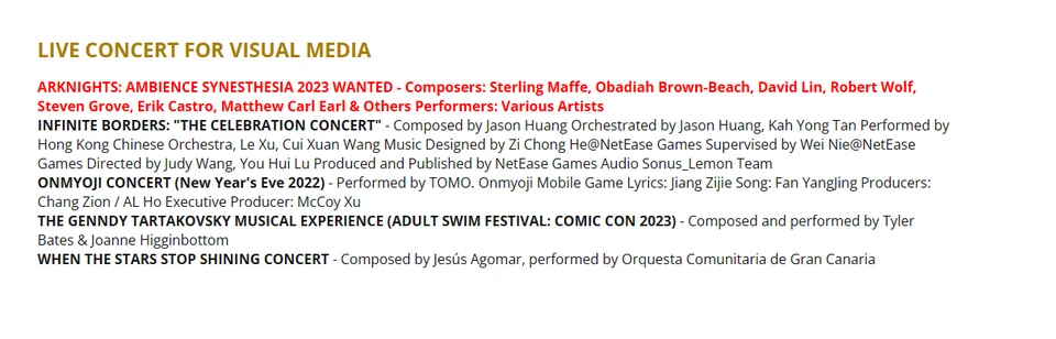 O Hollywood Music In Media Awards ou HMMA é um evento a qual homenageia compositores, letristas e supervisores musicais por suas contribuições na música para filmes, televisão e videogames. No dia 16/11/2023 foi anunciado os vencedores das várias categorias, e Arknights foi elegido na categoria “Concerto ao Vivo para Mídia Visual” com o seu concerto “Arknights: Ambience Synesthesia 2023 WANTED“.