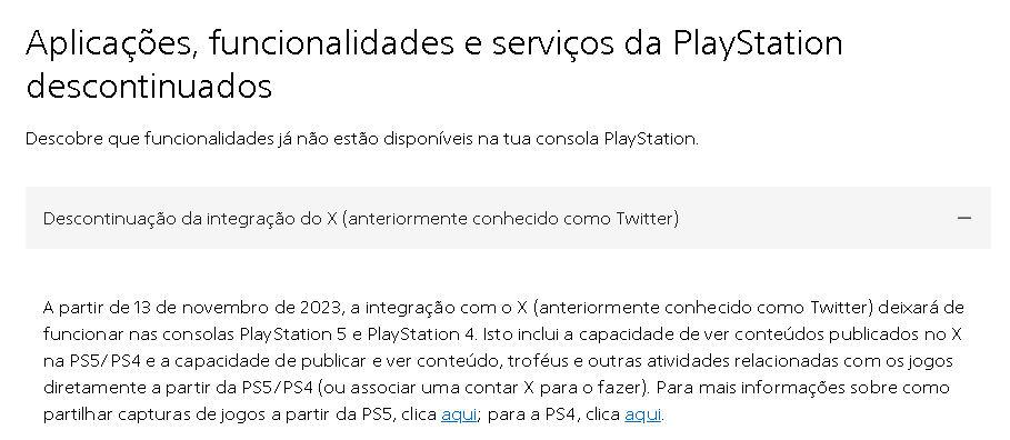 No dia 6 de Novembro de 2023, a Sony publicou em seu site uma nota dizendo que a integração com o Twitter / X será removida dos consoles PlayStation 4 e 5, os usuários não poderão mais subir imagens, vídeos ou os troféus conquistados para a plataforma, além de não poderem mais integrar suas contas com a rede social a partir do dia 13 de Novembro de 2023.