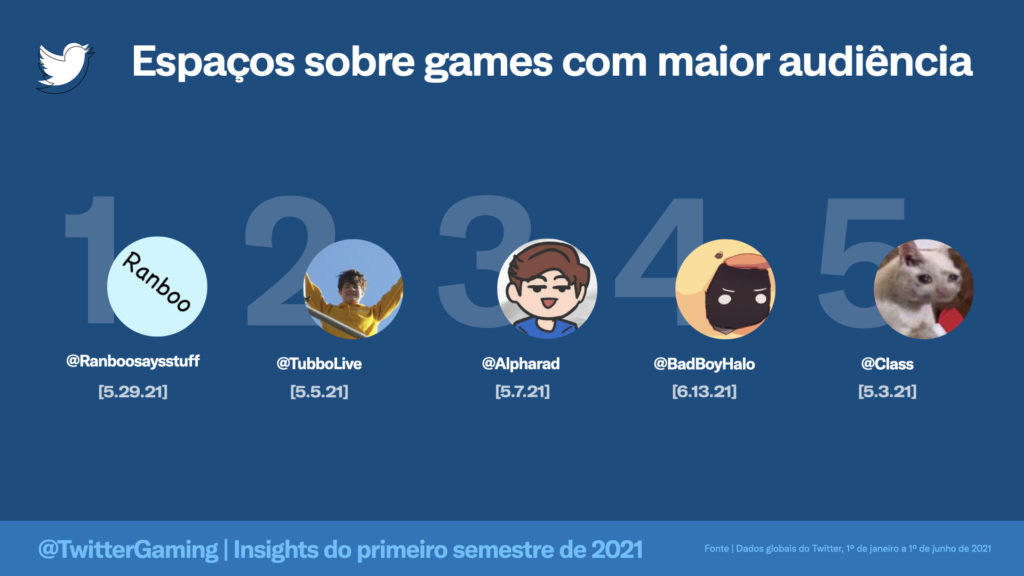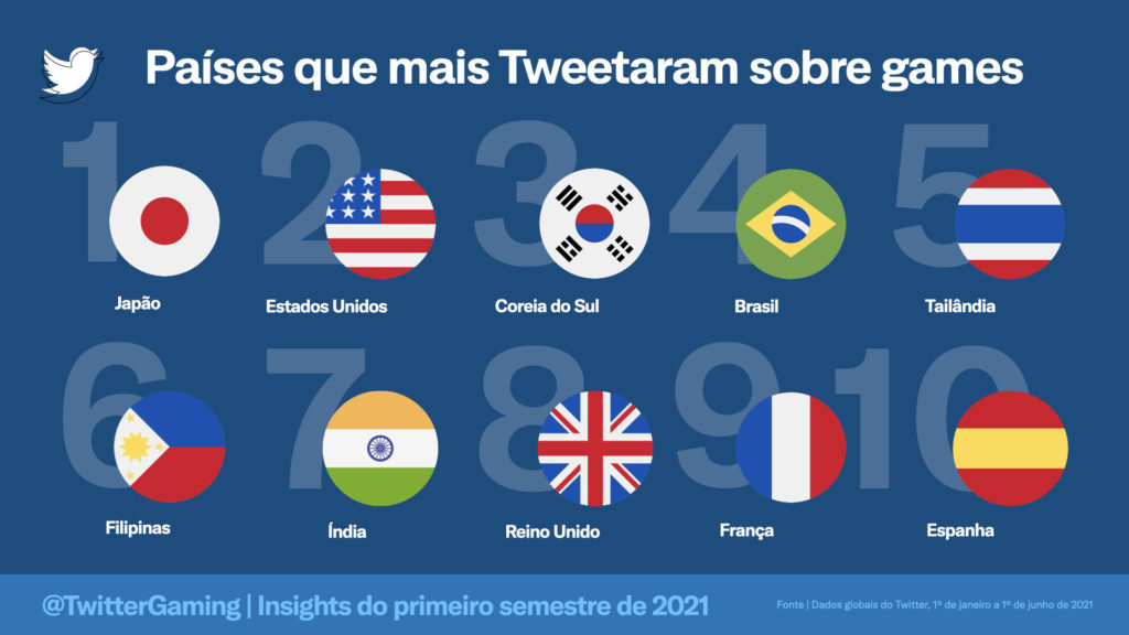 Os fãs de games marcam cada vez mais presença no Twitter e no ano de 2021 não tem sido diferente. De janeiro a junho deste ano, a plataforma já registrou globalmente um aumento de 18% em Tweets sobre o tema em relação ao mesmo período do ano passado, e o Brasil fez parte disso. Dentre as conversas sobre games no primeiro semestre, o Brasil foi o quarto país que mais Tweetou, atrás apenas do Japão, Estados Unidos e Coreia do Sul.