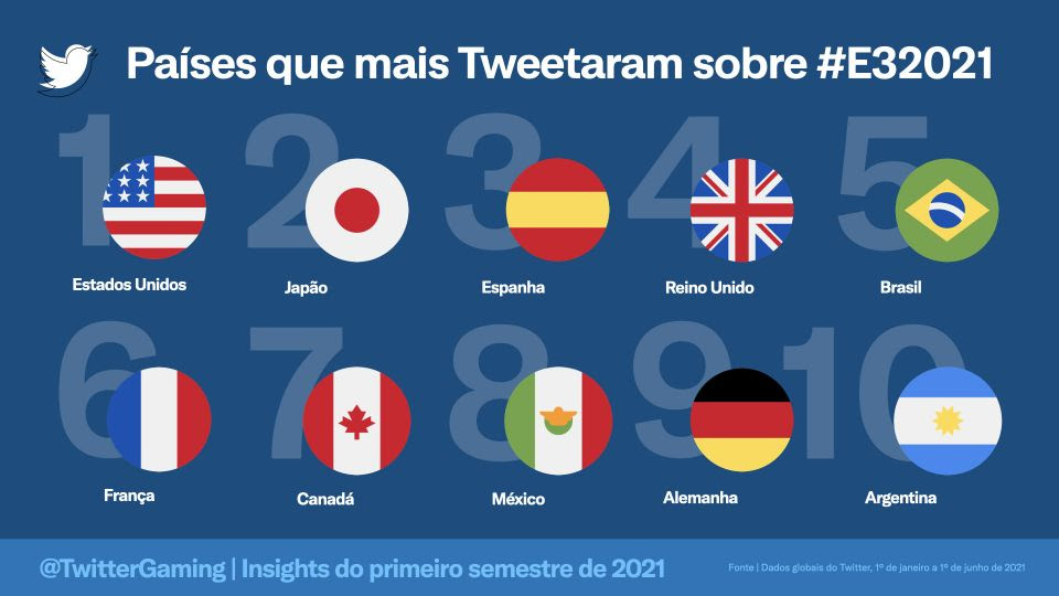 Neste mês, a E3 dominou o Twitter. O evento, transmitido de 12 a 15 de junho, voltou este ano em um formato apenas digital e pautou diversas conversas dos fãs brasileiros na plataforma. Como deu para ver, o Brasil também figurou no Top 5 da plataforma. Isto mais do que comprova que o público nacional é um dos maiores do mundo e as empresas podem olhar com muito mais carinho para cá, principalmente com lançamentos dignos como vemos ao redor do mundo, onde os jogadores recebem vários descontos e brindes incríveis!