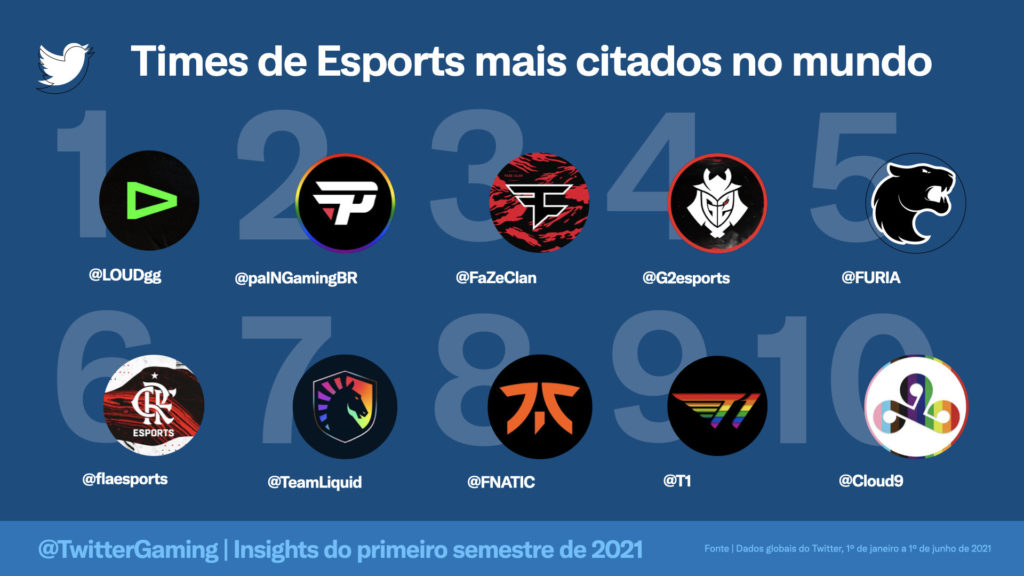 Além disso, os times de Esports do Brasil estão entre os mais comentados da plataforma em todo o mundo desde o início do ano. No ranking das dez equipes mais mencionadas no Twitter, em primeiro e segundo lugar figuram os brasileiros LOUD esports e paiN Gaming, respectivamente. Os times Furia e Flamengo Esports, também do Brasil, aparecem logo na sequência.