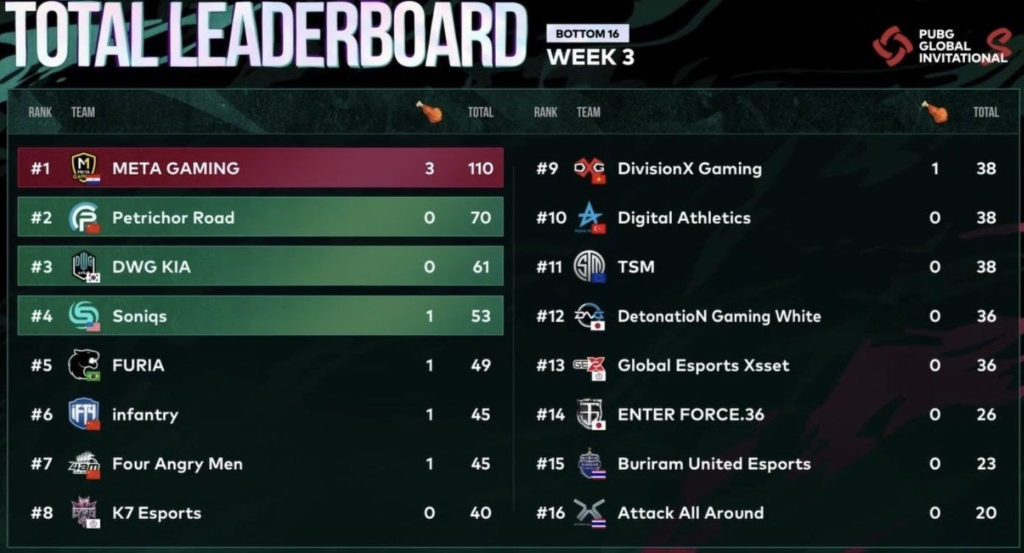 A Meta Gaming no entanto, mais uma vez, terminou na liderança, com três Chicken Dinners e 110 pontos. Com esse resultado, a equipe disputará a 4ª Weekly Survival a partir da segunda partida para garantir vaga na próxima Weekly Final.