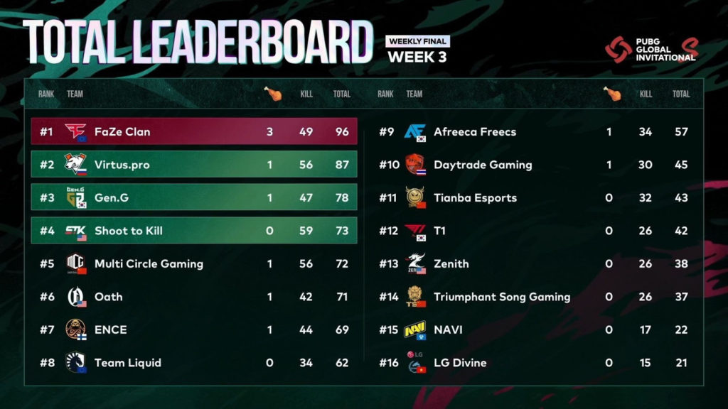 A FaZe Clan, equipe de jogadores europeus, venceu durante o final de semana a 3ª Weekly Final do PUBG Global Invitational S (PGI.S), campeonato internacional realizado na Coreia do Sul com a participação de 32 equipes, ao somar 96 pontos.
