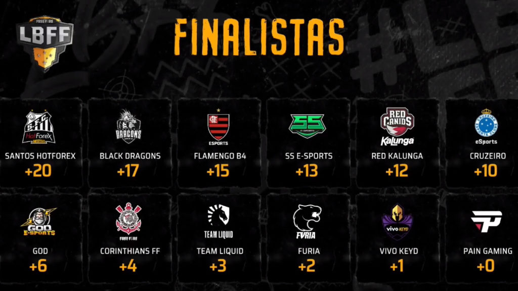 Santos (+20), Black Dragons (+17), Flamengo B4 (+15), SS E-Sports (+13), RED Kalunga (+12), Cruzeiro (+10), GOD (+6), Corinthians (+4), Team Liquid (+3), Furia (+2), Keyd (+1) e Pain Gaming (+0).