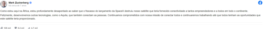 Não demorou muito para que Zuckerberg, que estava justamente na África no momento do desastre, fosse ao Facebook expressar sua frustração com o foguete Falcon 9 e o dono dele. A partir dali, Mark preferiu falar de tecnologias alternativas para sua vontade enquanto Musk foi justamente focar em lançar satélites da sua própria empresa. Ficou um clima estranho no ar.
