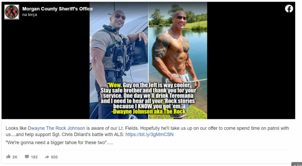 O tenente Eric Fields é o que se pode chamar de uma baita coincidência cósmica, já que ele é fisicamente idêntico ao ator Dwayne Johnson. O policial já ouviu muitas histórias sobre sua semelhança, mas isto ganhou um impulso ímpar quando uma moradora do Alabama fez um vídeo no Tik Tok comparando duas poses entre ambos.
