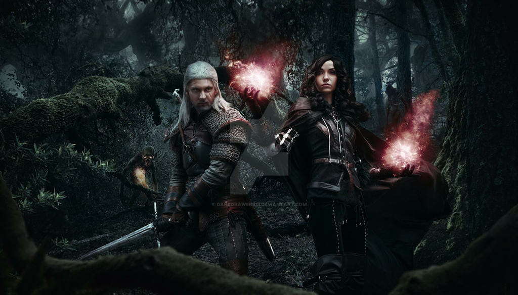 DarkDrawer513 foi até o fim com seu parceiro neste. Não são apenas os figurinos perfeitos em todos os detalhes, os efeitos posteriores que adicionam o fogo feito e os monstros na floresta fazem a foto parecer uma cena de um filme de Witcher.
