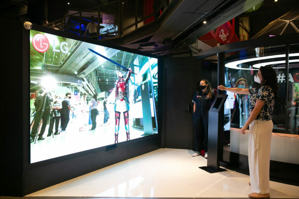A Mini Arena oferece a experiência interativa de realidade aumentada LAEB LG. Basta o visitante se posicionar a uma distância de 1,5 m do equipamento para o sensor da câmera detectar sua presença e iniciar a ativação.