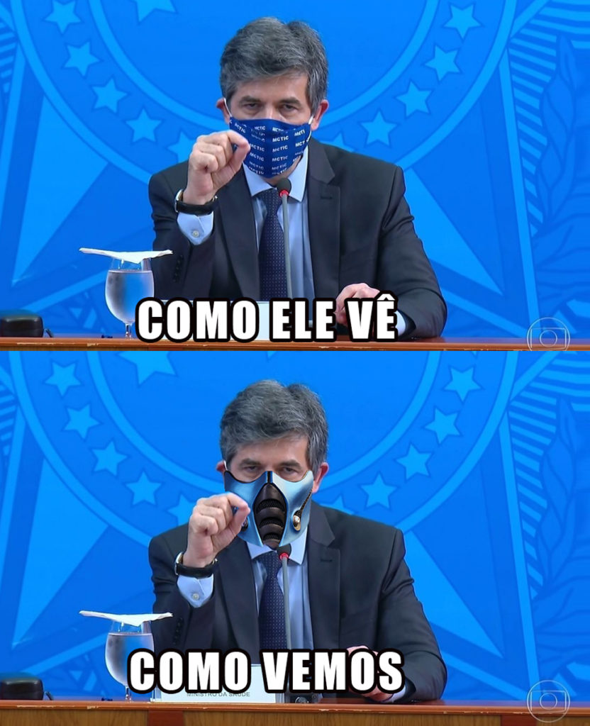 A coisa começou quando o Ministro começou a usar máscaras nas coletivas, algo que para muitos foi uma indireta declaração de “Fight” para o presidente. E se tem fight, o certo era por a máscara correta.