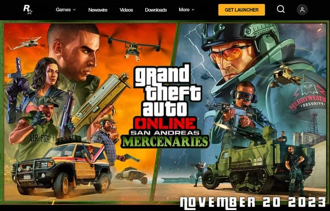 À direita desse ícone há um novo menu permanente contendo links alternativos de Jogos e Newswire, bem como aqueles que direcionam os usuários para as seções de Vídeos e Downloads do site. Falando em downloads, o redesenho adicionou um botão considerável solicitando aos usuários que instalem o Rockstar Games Launcher no canto superior direito de cada página do site.
