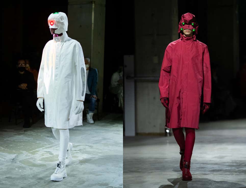 Abaixo, você confere essas jaquetas que, com os capuzes abaixados, parecem gabardinas regulares, com fitas de costura e zíperes práticos. Com capuzes, eles são tributos a Eva que não apenas modelam os designs de suas cabeças como também têm controles remotos que você pode usar para controlar os olhos de LED. Veja: