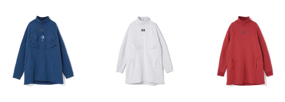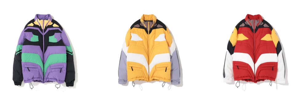 Porém, a peça central da coleção é uma linha de agasalhos que vai além de ‘inspirada em Evangelion’ para ‘cosplay Evangelion’. As jaquetas puffer abaixo custam US$ 5.600 dólares (R$ 31 mil reais).