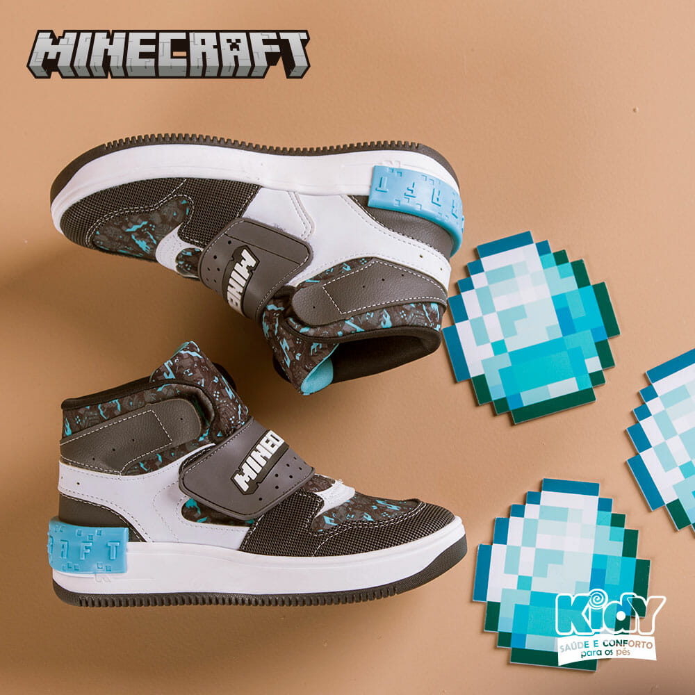 Os cenários multicoridos e pixados do jogo, com seus blocos, skins e mobs, agora terão espaço nos calçados Kidy.  A coleção, que conta com mais de 20 itens, entre tênis, slides, galochas, sapatilhas, babuches e slippers, e com numeração que vai do 25 até o 39, chega repleta cores, tecnologia e conforto para deixar os pés das crianças estilosos e protegido para suas aventuras.