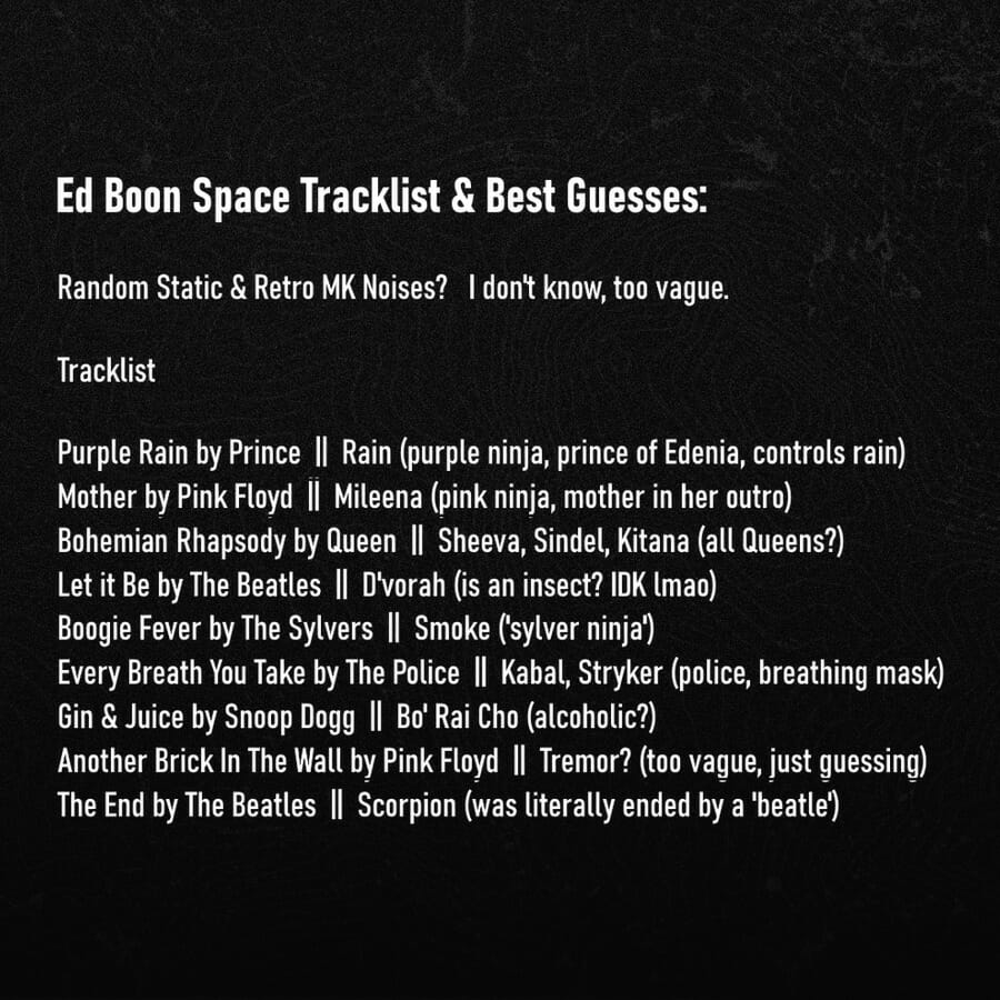 Seja pelo nome do cantor, da música ou de algum elemento que contenha nela, as pistas estão fazendo os fãs especularem o que poderia ser a presença confirmada de personagens como Rain, Mileena, Sindel, Smoke, Stryker, Scorpion, e outros.