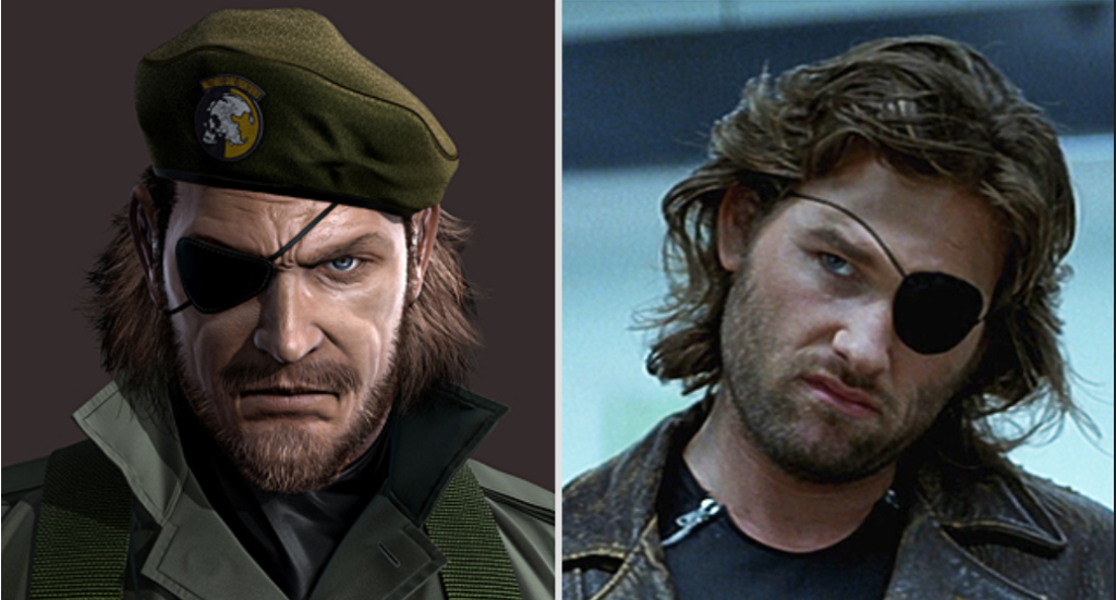 A primeira imagem é do aclamado Solid Snake, personagem criado em 1987 da série Metal Gear e a segunda Snake Plissken, de 1981 do filme Fuga de Nova York de John Carpenter, interpretado por Kurt Russell. Notaram a semelhança? Pois é, Solid Snake não foi algo inédito e sim uma adaptação de Snake Plissken? Aliás, Snake Plissken como Solid, é um soldado, só que mais experiente.